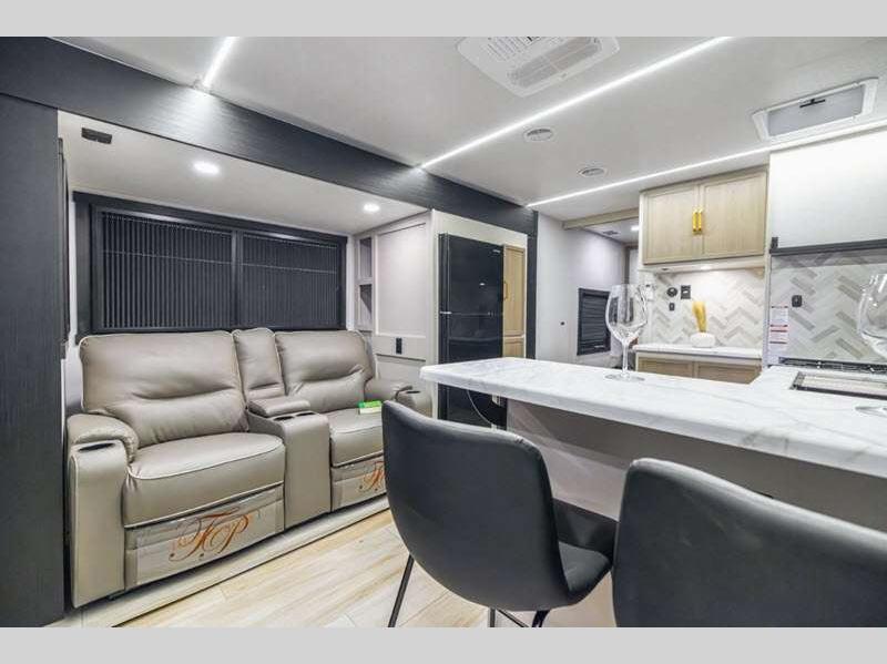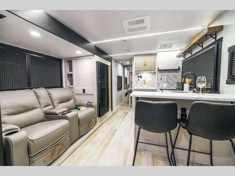 Sleeps 10 Slides 1 Length 36 ft 10 in Ext Width 8 ft Ext Height 10 ft 10 in Hitch Weight 965 lbs Dry Weight 7173 lbs Cargo Capacity 2592 lbs Fresh Water Capacity 49 gals Grey Water Capacity 60 gals Black Water Capacity 30 gals Number Of Bunks 2 Available Beds Queen with Versa-Tilt Refrigerator Type 12V Black Refrigerator Size 10 cu ft Cooktop Burners 3 Shower Size 30" x 36" Number of Awnings 1 Water Heater Type Tankless AC BTU 15000 btu TV Info LR 40" LED Smart TV Awning Info 18' with LED Lights Axle Count 2 Shower Type Walk-In Shower Similar Floorplans