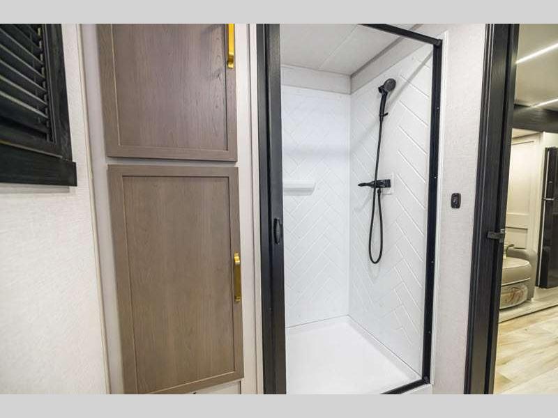 Sleeps 5 Slides 1 Length 34 ft Ext Width 8 ft Ext Height 10 ft 10 in Hitch Weight 725 lbs Dry Weight 6758 lbs Cargo Capacity 2767 lbs Fresh Water Capacity 49 gals Grey Water Capacity 62 gals Black Water Capacity 32 gals Available Beds Queen with Versa-Tilt Refrigerator Type 12V Black Refrigerator Size 10 cu ft Cooktop Burners 3 Shower Size 30" x 36" Number of Awnings 1 Water Heater Type On Demand Tankless AC BTU 18000 btu TV Info LR 40" TV Awning Info with LED Lights Axle Count 2 Washer/Dryer Available Yes Shower Type Walk-In Shower Similar Floorplans