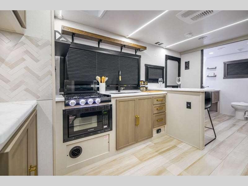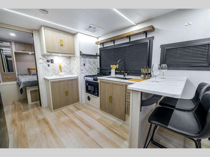 The Weather Shield one-piece fiberglass roof is ultra durable and the enclosed underbelly will help with better temperature control. There is also a shaded pet tether outside, along with a 2" accessory hitch receiver for more camp gear, and an awning with LED lights to name a few more conveniences. Head inside to enjoy Temple Cherry cabinetry with matte gold hardware, painted hardwood interior trim, and 60" x 80" bed for a comfortable stay!