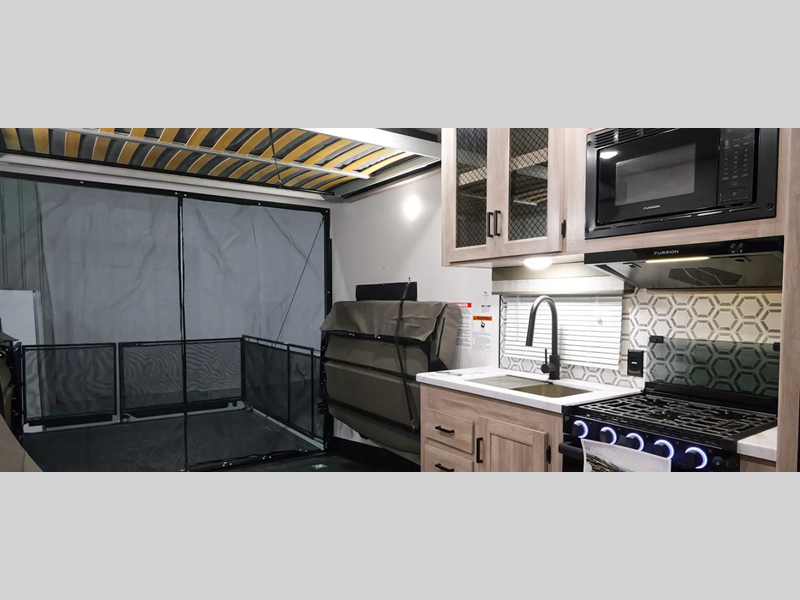There is fiberglass flooring insulation that will withstand your many adventures plus a rear beaver tail frame for easy unloading and an external fuel cell with a pump. You will feel right at home with decorative glass cabinet doors and LED lights, and there is a tankless water heater to provide endless hot showers after trail riding. The Alumifoil insulated enclosed underbelly will help extend your camping season, and each model is back up camera ready if you want to make parking easier than ever.